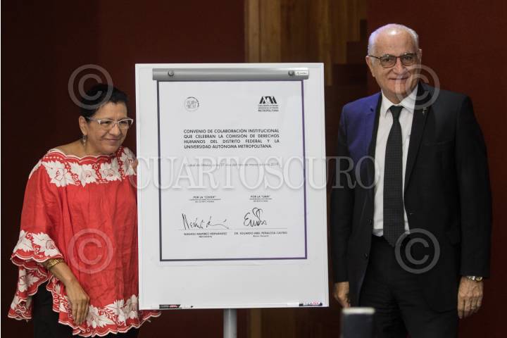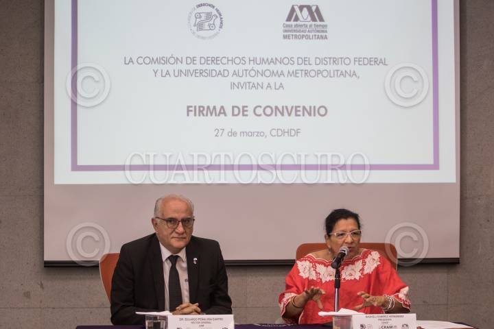 CIUDAD DE MÉXICO, 27MARZO2019.- Nashieli Ramírez Hernández, presidenta de la CDHDF, y Eduardo Abel Peñalosa Castro, rector de la UAM, firmaron un convenio de colaboración entre ambas instituciones. FOTO: ISAAC ESQUIVEL /CUARTOSCURO.COM