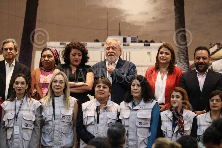 Alejandro Encinas Rodríguez, Subsecretario de Derechos Humanos, Población y Migración; Martha Yuriria Rodríguez Estrada, Comisionada Ejecutiva de Atención a Víctimas; María Fabiola Alanís Sámano, Comisionada Nacional para Prevenir y Erradicar la Violencia contra las Mujeres; Andrés Alfonso Ramírez Silva, Coordinador General de la Comisión Mexicana de Ayuda a Refugiados; Claudia Morales Reza, Titular del Consejo Nacional para Prevenir la discriminación y Félix Santana Ángeles, Director General de Estrategias para la Atención de Derechos Humanos durante el primer informe de avances y resultados Reconstruyendo redes de CEAV de la SEGOB que se llevó a cabo en la misma.