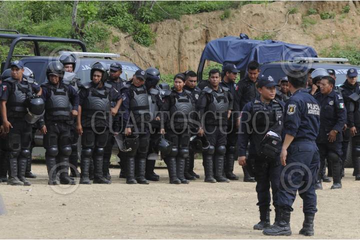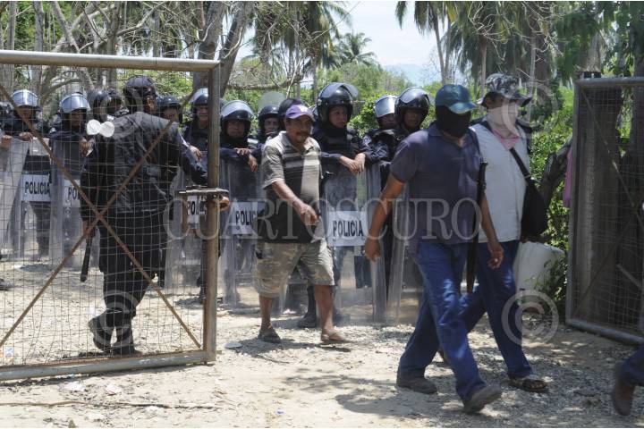 ACAPULCO, GUERRERO, 04JUNIO2014.- Marinos policías estatales antimotines tomaron el control de la planta de captación de agua Papagayo 2, que la Comisión de Agua Potable y Alcantarillado del Municipio de Acapulco (Capama) tiene en la comunidad de Salsipuedes, en la orilla del río Papagayo, luego de que los equipos de bombeo fueran apagados por integrantes del Consejo de Ejidos y Comunidades Opositores a la presa La Parota (Cecop), el pasado martes. La movilización, que buscaba principalmente que las autoridades liberen al campesino José Palma Tornés, detenido el pasado 29 de mayo acusado de tentativa de homicidio, luego de un enfrentamiento a balazos entre policías comunitarios de Cacahuatepec y pobladores de Parotillas. Después de un acuerdo con los comunitarios, se volvió a normalizar el servicio. FOTO: BERNANDINO HERNÁNDEZ /CUARTOSCURO.COM