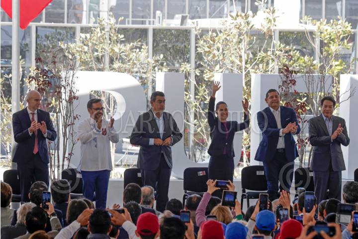 PUEBLA, PUEBLA, 11DICIEMBRE2024.- Carlos Torres Rosas, coordinador general de los Programas para el Bienestar; Arturo Reyes Sandoval, director general del Instituto Politécnico Nacional (IPN); Sergio Salomón Céspedes, gobernador de Puebla; Claudia Sheinbaum, Presidenta de México; Alejandro Armenta Mier, gobernador electo de Puebla, y Mario Delgado, titular de la SEP, durante la inauguración del CECyt No. 20 “Natalia Serdán Alatriste” y de la UPII “Alejo Peralta”. FOTO: MIREYA NOVO/CUARTOSCURO.COM