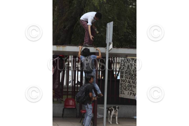 MEXICO, D.F., 26SEPTIEMBRE2014.-Alumnos de la Vocacional 13 del IPN se unieron a las protestas en contra de la entrada en vigor del nuevo reglamento interno y plan de estudios de esta institución educativa, no obstante el anuncio de que dicha entrada en vigor se postergaría debido a los manifiestaciones del día de ayer. A partir de las 7 horas se reunieron afuera del plantel con carteles en contra de Yoloxóchitl Bustamante, directora general del Politécnico, y en repudio a las modificaciones en el reglamento, que afirman endurece las sanciones académicas y rebaja el nivel académico y el perfil del egresado. En la imagen, estudiantes bloquean una de las entradas del CECyT 13. FOTO: DAVID POLO /CUARTOSCURO.COM