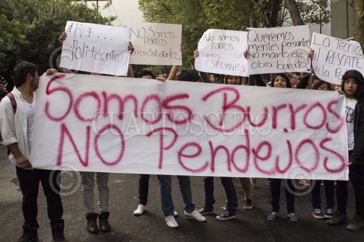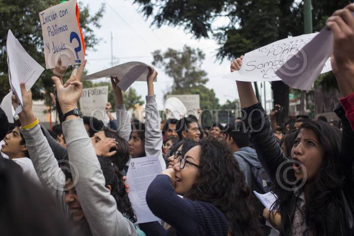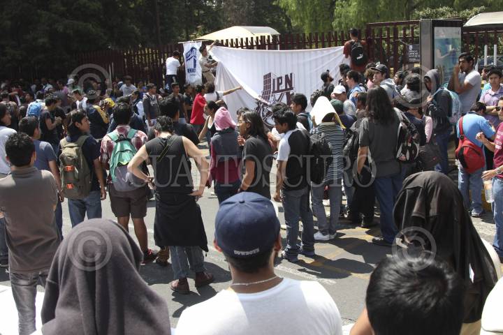 MEXICO, D.F., 26SEPTIEMBRE2014.-Alumnos de la Vocacional 13 del IPN se unieron a las protestas en contra de la entrada en vigor del nuevo reglamento interno y plan de estudios de esta institución educativa, no obstante el anuncio de que dicha entrada en vigor se postergaría debido a los manifiestaciones del día de ayer. A partir de las 7 horas se reunieron afuera del plantel con carteles en contra de Yoloxóchitl Bustamante, directora general del Politécnico, y en repudio a las modificaciones en el reglamento, que afirman endurece las sanciones académicas y rebaja el nivel académico y el perfil del egresado. FOTO: DAVID POLO /CUARTOSCURO.COM