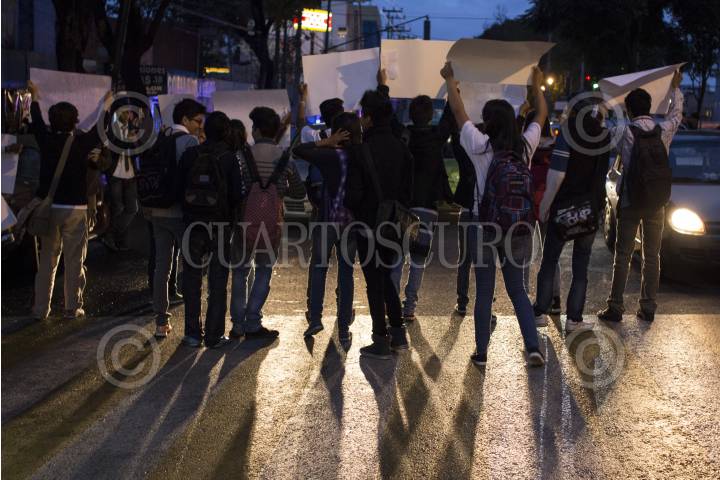 MEXICO, D.F., 26SEPTIEMBRE2014.-Alumnos de la Vocacional 13 del IPN se unieron a las protestas en contra de la entrada en vigor del nuevo reglamento interno y plan de estudios de esta institución educativa, no obstante el anuncio de que dicha entrada en vigor se postergaría debido a los manifiestaciones del día de ayer. A partir de las 7 horas se reunieron afuera del plantel con carteles en contra de Yoloxóchitl Bustamante, directora general del Politécnico, y en repudio a las modificaciones en el reglamento, que afirman endurece las sanciones académicas y rebaja el nivel académico y el perfil del egresado. En la imagen, estudiantes se colocan frente a los autos durante la luz roja del semáforo en la avenida Taxqueña con carteles en contra del nuevo reglamento. FOTO: DAVID POLO /CUARTOSCURO.COM