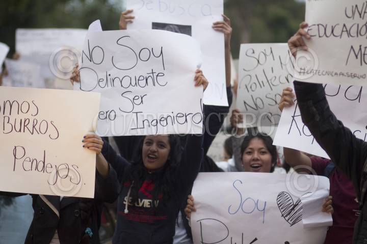 MÉXICO, D.F., 25SEPTIEMBRE2014.- Alumnos de diversos planteles de los Centros de Estudios Científicos y Tecnológicos (CECYT) y plantes de nivel superior realizaron una mega marcha en diversos contingentes que partieron de distintos puntos de la capital hacia las instalaciones del IPN ubicadas en Zacatenco, los estudiantes exigieron la revocación del nuevo plan de estudios del Instituto Politécnico Nacional. FOTO: SAÚL LÓPEZ /CUARTOSCURO.COM