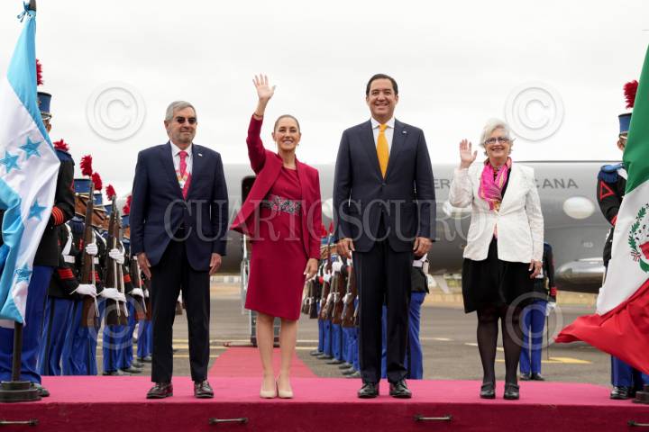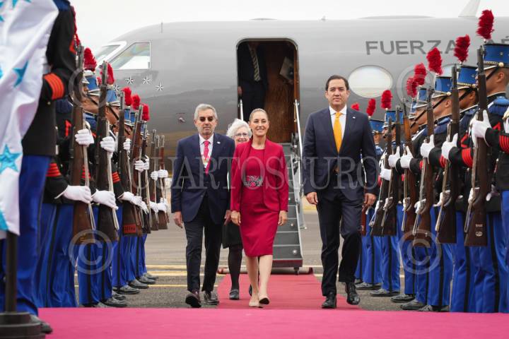 TEGUCIGALPA, HONDURAS, 09ABRIL2025.- Claudia Sheinbaum, Presidenta de México, arribo a Tegucigalpa, para asistir a la IX Cumbre de la Comunidad de Estados Latinoamericanos y Caribeños (Celac); fue recibida por el secretario privado de la presidenta Xiomara Castro Sarmiento, Héctor Manuel Zelaya Castro. Acompañan a la primera mandataria mexicana: el secretario de Relaciones Exteriores, Juan Ramón de la Fuente Ramírez; y la subsecretaria para América Latina y el Caribe, Raquel Serur Smeke. FOTO: PRESIDENCIA/CUARTOSCURO.COM