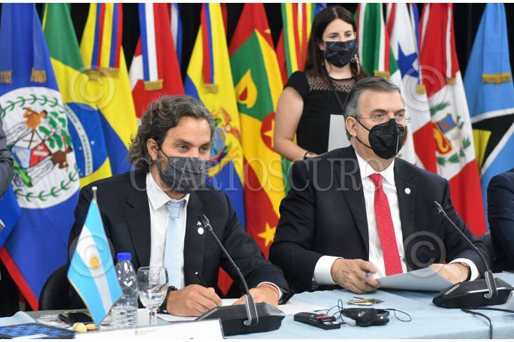 Santiago Cafiero, canciller de Argentina y Marcelo Ebrard, canciller de México, durante la XXII Reunión de Cancilleres de la Comunidad de Estados Latinoamericanos y Caribeños (CELAC).