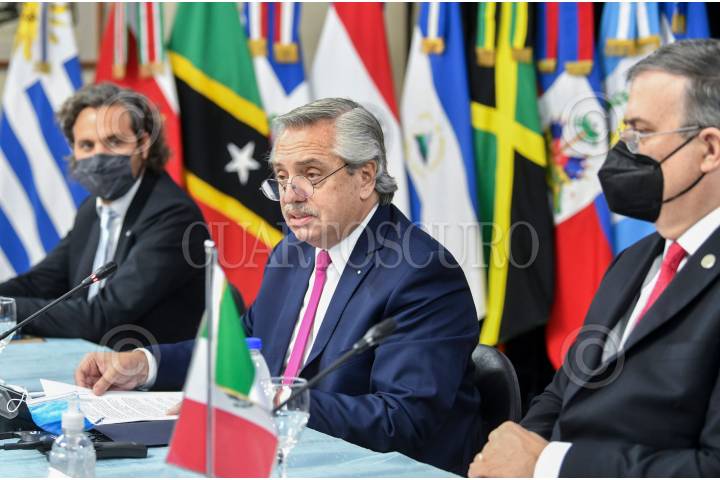 Santiago Cafiero, canciller de Argentina; Alberto Fernández, presidente de Argentina, y Marcelo Ebrard, secretario de Relaciones Exteriores, encabezaron la XXII Reunión de Cancilleres de la Comunidad de Estados Latinoamericanos y Caribeños (CELAC).