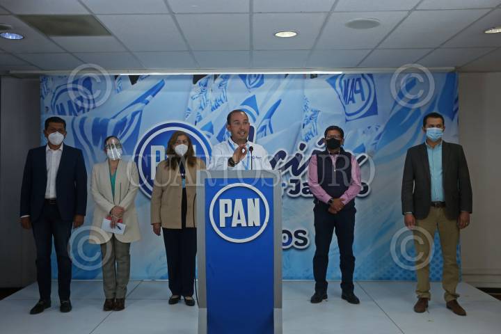 El Presidente Nacional del CEN del PAN Marko Cortés, durante una conferencia de prensa en compañía del Comité Directivo de Jalisco.