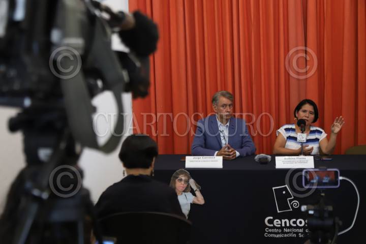 Jorge Carrasco, director de la Revista Proceso y Balbina Flores Representante en México de Reporteros sin fronteras durante la conferencia de prensa a 11 años sin justicia para la periodista asesinada Regina Martínez, en el Centro Nacional de Comunicación Social (Cencos).