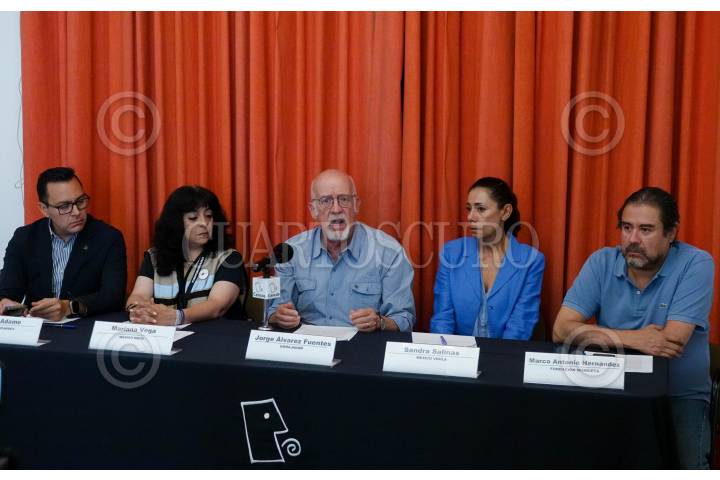 CIUDAD DE MÉXICO, 31MAYO2024.- Alan Adame, representante Coparmex, Mariana Vega, representante de México MOCE, Jorge Álvarez Fuentes, embajador y director Director General para África y Medio Oriente de la SRE, Sandra Salinas, integrante de México Vigila, y Marco Antonio Hernández, integrante fundación Murrieta, durante la conferencia “Decanos de la Observación Electoral” en el Centro de Comunicación Social (CENCOS) con motivo de los comicios electorales del próximo 02 de junio. FOTO: GALO CAÑAS/CUARTOSCURO.COM