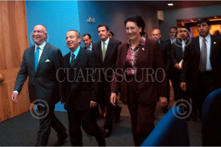 MÉXICO D.F. 10AGOSTO2006.- La diputada Elizabeth Yañez, Pablo González Carbonell, vicepresidente de CENET, Felipe Calderón candidato del PAN a la presidencia y Pablo Azcárraga, presidente de la Asociación de Cadenas de Hoteles durante el encuentro con el Consejo de Nacional Empresarial Turistico. FOTO: Guillermo Perea/CUARTOSCURO.COM