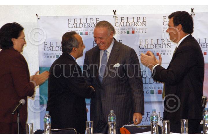 MÉXICO D.F. 10AGOSTO2006.- La diputada Elizabeth Yañez, Felipe Calderón candidato del PAN a la presidencia, Pablo González Carbonell, vicepresidente de CENET y Pablo Azcárraga, presidente de la Asociación de Cadenas de Hoteles durante el encuentro con el Consejo de Nacional Empresarial Turistico. FOTO: Guillermo Perea/CUARTOSCURO.COM
