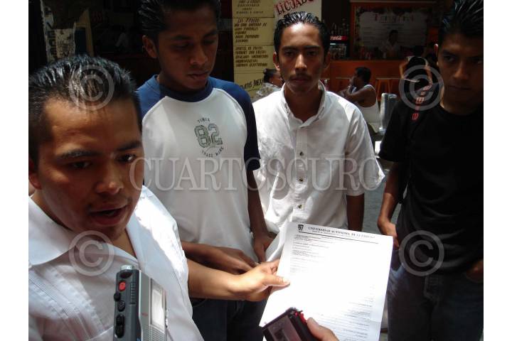 CHILPANCINGO, GUERRERO, 23MAYO2007.- Integrantes de la Federacion Estudiantil Universitaria Guerrerense (FEUG) encabezados por Abundio Gonzalez Reyes, en conferencia de prensa denunciaron irregularidades en la aplicacion en el examen del CENEVAL asi como en la aceptacion de mas de 2500 jovenes estudiantes universitarios los cuales fueron rechazados de las unidades academicas de ingenieria, derecho, economia entre otras mas, por lo cual anunciaron movilizaciones para la proxima semana. FOTO: OSCAR ALVARADO/CUARTOSCURO.COM