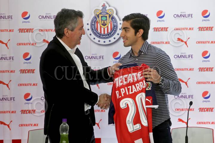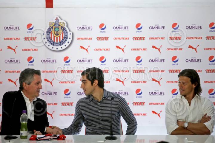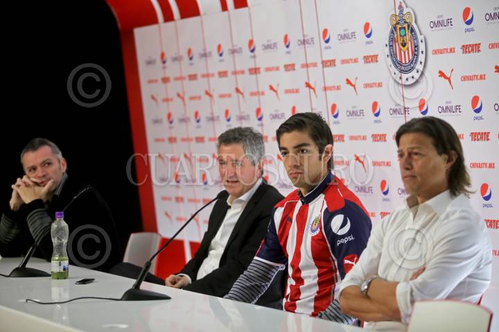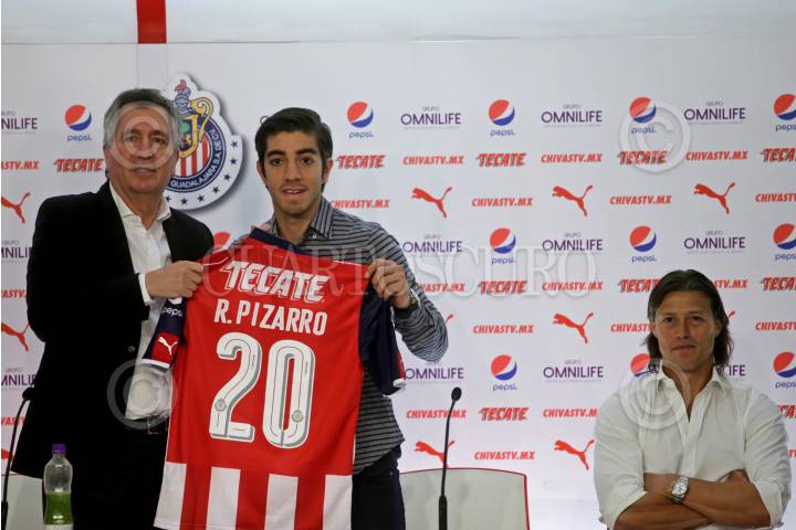 ZAPOPAN, JALISCO. 13DICIEMBRE2016.- Jorge Vergara, dueño del Club Guadalajara; Matías Almeida, Director Técnico; José Luis Higuera, CEO del Grupo Omnilife, encabezaron la presentación del nuevo refuerzo de Chivas, Rodolfo Pizarro, jugador proveniente del Club Pachuca. El evento se llevó a cabo en las instalaciones del estadio Chivas. FOTO: FERNANDO CARRANZA GARCIA /CUARTOSCURO.COM