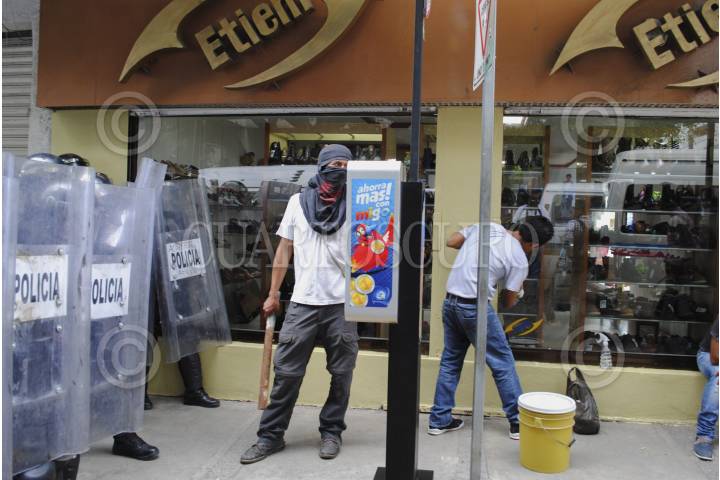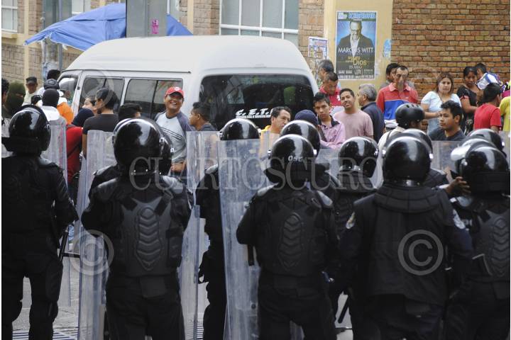 CHILPANCINGO, GUERRERO, 27MAYO2015.- Integrantes de la Coordinadora Estatal de Transportistas Independientes del Estado de Guerrero (CETIG) tomaron por algunas horas el edificio Juan Álvarez, ubicado en la calle Cinco de Mayo y 16 de Septiembre, en el centro de esta ciudad, esto en exigencia de entregar concesiones a los verdaderos trasportistas y el esclarecimiento de uno de sus compañeros asesinados. Al lugar acudieron policías estatales con equipo antimotines, que esperaron que los manifestantes se retiraran. FOTO: JOSÉ I. HERNÁNDEZ /CUARTOSCURO.COM