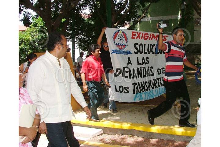 Chilpancingo, Guerrero, 14MARZO2005.- El gobernador del estado, Rene Juarez Cisneros, a su llegada a la plazoleta del barrio de Tequicorra, en donde inicio la gira de despedida de los cuatro barrios tradicionales de la ciudad inaugurando obras, ahí fue recibido por integrantes de la Coordinadora Estatal de Transportistas Independientes de Guerrero (CETIG) quienes protestaron para exigir la entrega de permisos y concesiones para la ruta Petaquillas-Chilpancingo. Foto: Oscar Alvarado/CUARTOSCURO.COM