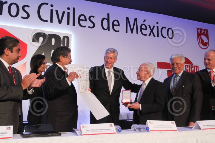 CIUDAD DE MÉXICO, 08MARZO2016.- Víctor Ortíz Ensástegui, presidente del XXXV Consejo Directivo del Colegio de Ingenieros Civiles de México y Gerardo Ruiz Esparza, secretario de Comunicaciones y Transportes, entregan al Dr. Luis Esteva Maraboto, el Premio Nacional de Ingeniería Civil, realizado en el Hotel de la Ciudad de México. FOTO: ADOLFO VLADIMIR /CUARTOSCURO.COM