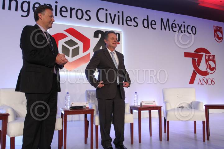 CIUDAD DE MÉXICO, 08MARZO2016.- Leo Zuckermann, comentarista televisivo y Pedro Joaquín Coldwell, secretario de Energía, durante el inicio de la mesa redonda: La Reforma Energética, como parte las actividades del 28 Congreso Nacional de Ingeniería Civil, realizado en el Hotel de la Ciudad de México. FOTO: ADOLFO VLADIMIR /CUARTOSCURO.COM