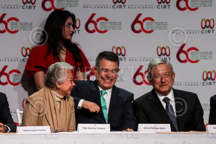 CIUDAD DE MÉXICO, 07NOVIEMBRE2019.- Olga Sánchez Cordero, secretaria de Gobernación; José Luis Rodríguez Aguirre, presidente de la Cámara Nacional de la Industria de Radio y Televisión (CIRT); y Andrés Manuel López Obrador, presidente de México, durante la celebración de la 60 Semana Nacional de Radio y Televisión, así como la entrega de premios CIRT. FOTO: GALO CAÑAS /CUARTOSCURO.COM