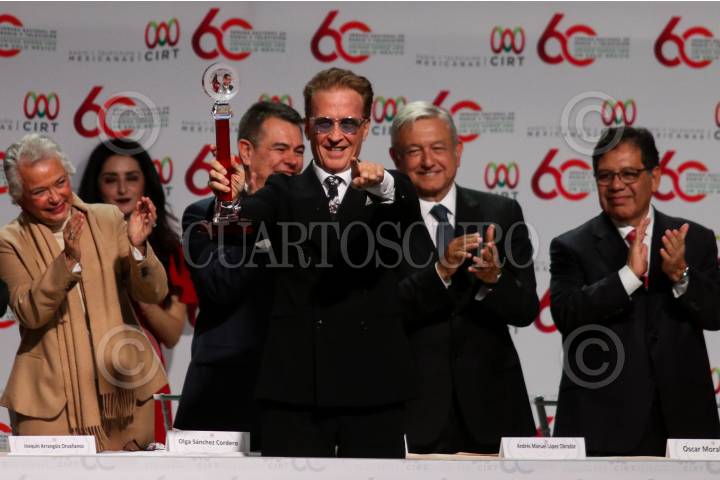 CIUDAD DE MÉXICO, 07NOVIEMBRE2019.- Olga Sánchez Cordero, secretaria de Gobernación; José Luis Rodríguez Aguirre, presidente de la Cámara Nacional de la Industria de Radio y Televisión (CIRT); y Andrés Manuel López Obrador, presidente de México, durante la celebración de la 60 Semana Nacional de Radio y Televisión, así como la entrega de premios CIRT. En la imagen, el cantante Emmanuel presume su galardón. FOTO: GALO CAÑAS /CUARTOSCURO.COM