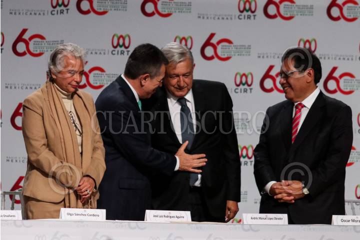 CIUDAD DE MÉXICO, 07NOVIEMBRE2019.- Olga Sánchez Cordero, secretaria de Gobernación; José Luis Rodríguez Aguirre, presidente de la Cámara Nacional de la Industria de Radio y Televisión (CIRT); Andrés Manuel López Obrador, presidente de México, y Oscar Morales Ruiz, durante la celebración de la 60 Semana Nacional de Radio y Televisión, así como la entrega de premios CIRT. FOTO: GALO CAÑAS /CUARTOSCURO.COM