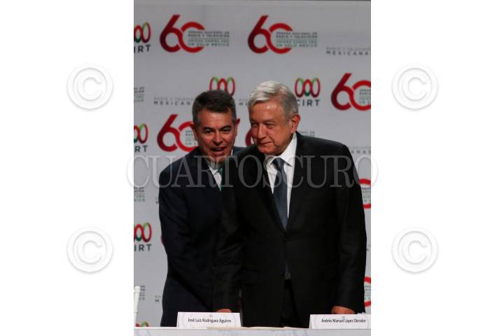 CIUDAD DE MÉXICO, 07NOVIEMBRE2019.- José Luis Rodríguez Aguirre, presidente de la Cámara Nacional de la Industria de Radio y Televisión (CIRT); y Andrés Manuel López Obrador, presidente de México, durante la celebración de la 60 Semana Nacional de Radio y Televisión, así como la entrega de premios CIRT. FOTO: GALO CAÑAS /CUARTOSCURO.COM