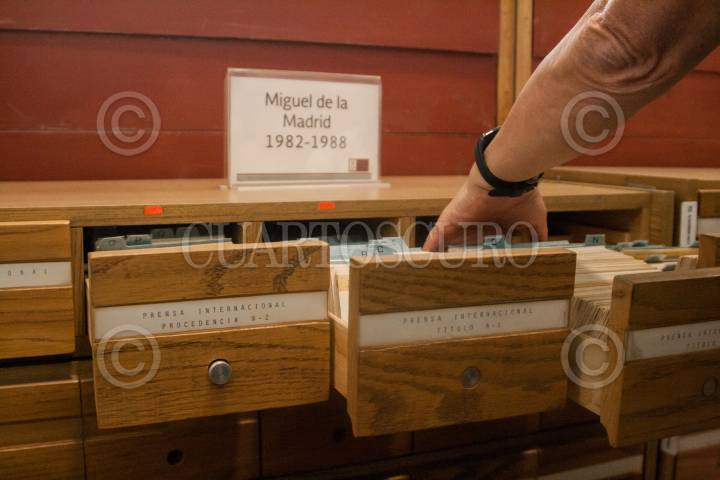 CIUDAD DE MÉXICO, 16ABRIL2019.- En el Archivo General de la Nación fue presentada la versión pública de los archivos de espionaje del Centro de Investigación y Seguridad Nacional (CISEN) “sobre los informes que se generaron en el periodo del 14 de junio de 1979 al 13 septiembre de 1983” los cuales abarcan la trayectoria política del actual presidente Andrés Manuel López Obrador. En la imagen, un reportero revisa las fichas de los archivos que alberca el recinto. FOTO: GALO CAÑAS /CUARTOSCURO.COM