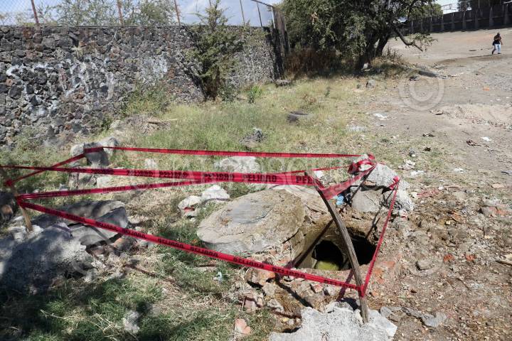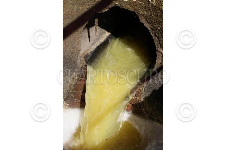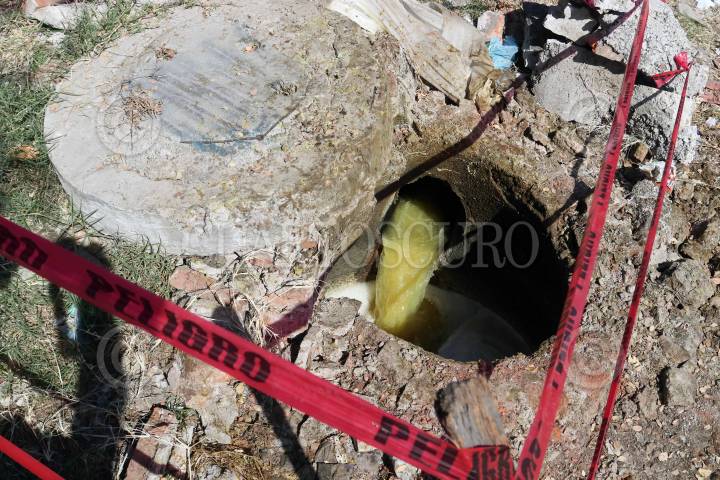 Una alcantarilla abierta deja ver el agua contaminada color amarilla que desechan las fábricas de la ciudad industrial de Morelos.