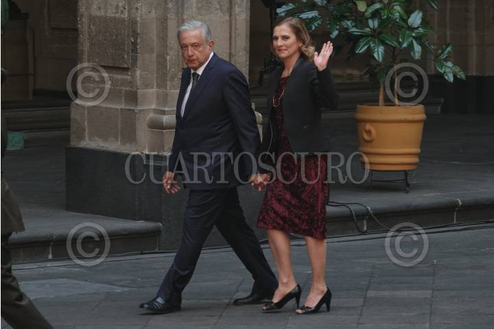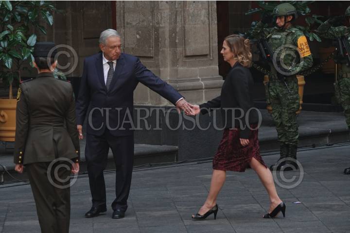 Andrés Manuel López Obrador, presidente de México, acompañado de su esposa Beatriz Gutiérrez Müller, se retiraron de la ceremonia del CIX Aniversario luctuoso de Francisco I. Madero, realizado en el Patio de Honor del Palacio Nacional