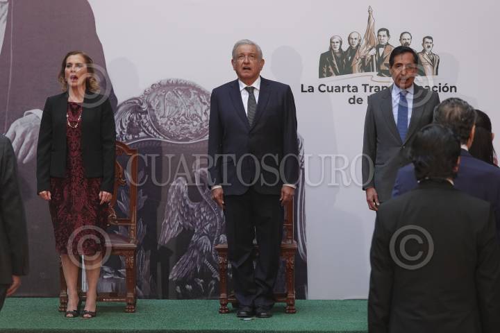 Andrés Manuel López Obrador, presidente de México, acompañado de su esposa Beatriz Gutiérrez Müller y Rogelio Ramírez de la O, secretario de Hacienda y Crédito Público, encabezaron la ceremonia del CIX Aniversario luctuoso de Francisco I. Madero, realizado en el Patio de Honor del Palacio Nacional