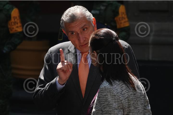 Adán Augusto López, secretario de Gobernación, y Claudia Sheinbaum, jefa de Gobierno, conversaron durante el CIX Aniversario luctuoso de Francisco I Madero, realizado en el Patio de Honor en Palacio Nacional