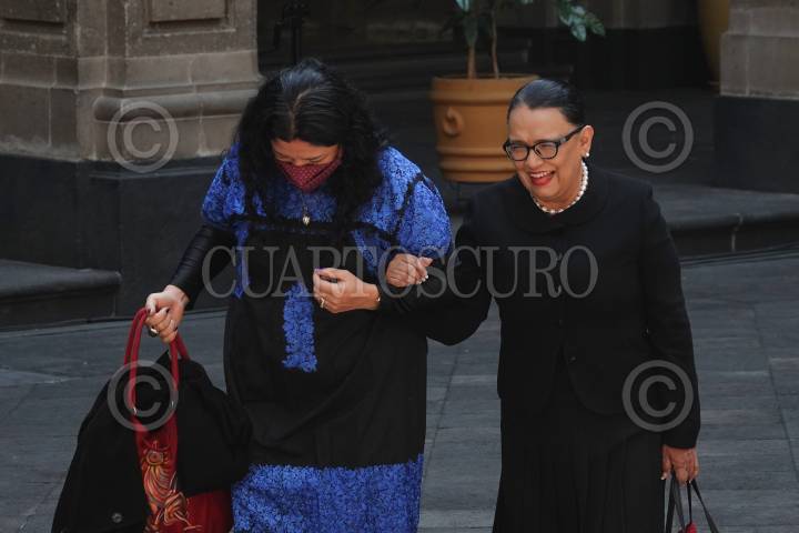 Alejandra Frausto, secretaria de Cultura, y Rosa Isela Rodríguez, secretaria de Seguridad Ciudadana, durante el CIX Aniversario luctuoso de Francisco I Madero, realizado en el Patio de Honor en Palacio Nacional