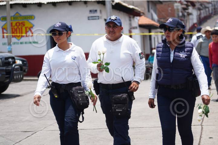 TACÁMBARO, MICHOACÁN, 06JUNIO2025. Elementos de policía de Michoacán llevan rosas blancas a los servicios funerarios del alcalde Salvador Bastida García y su escolta Pastor Cortés Álvarez, quienes fueron asesinado la noche de ayer cuando viajaban a bordo de una camioneta Ford. Las causas del doble crimen todavía no han sido esclarecidas y la Fiscalía local ya trabaja en el caso. FOTO: JUAN JOSÉ ESTRADA SERAFÍN/CUARTOSCURO.COM