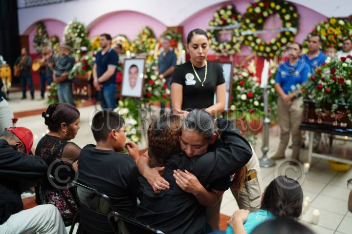 TACÁMBARO, MICHOACÁN, 06JUNIO2025.- Una oficial de policía abraza a una de las familiares (sin identificar) durante los servicios funerarios del alcalde Salvador Bastida García y su escolta Pastor Cortés Álvarez, quienes fueron asesinado la noche de ayer cuando viajaban a bordo de una camioneta Ford. Las causas del doble crimen todavía no han sido esclarecidas y la Fiscalía local ya trabaja en el caso. FOTO: JUAN JOSÉ ESTRADA SERAFÍN/CUARTOSCURO.COM