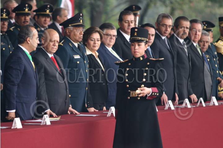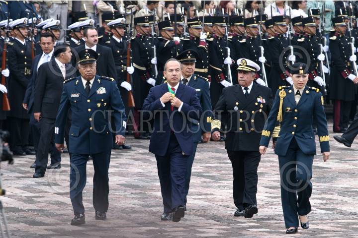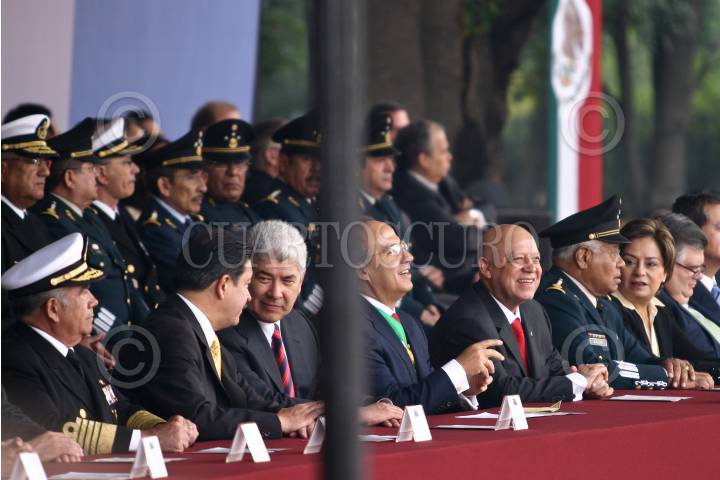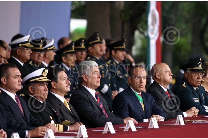 MÉXICO, D.F. 13SEPTIEMBRE2009.- Guillermo Galván, secretario de Defensa; Guillermo Ortiz Mayagoitia, ministro de la Suprema Corte de Justicia; el presidente Felipe Calderón; Francisco Ramírez Acuña, presidente de la mesa directiva de la Cámara de Diputados; Carlos Navarrete, presidente de la mesa directiva del Senado de la República; Francisco Saynez, secretario de Marina y Genaro Garcia Luna, titular de la Secretaria de Seguridad pública Federal durante la guardia de honor en la ceremonia conmemorativa al CLXII aniversario de la gesta heroica de los Niños Héroes que se realizo en el al Altar a la Patria del Bosque de Chapultepec. FOTO: RODOLFO ANGULO/CUARTOSCURO.COM