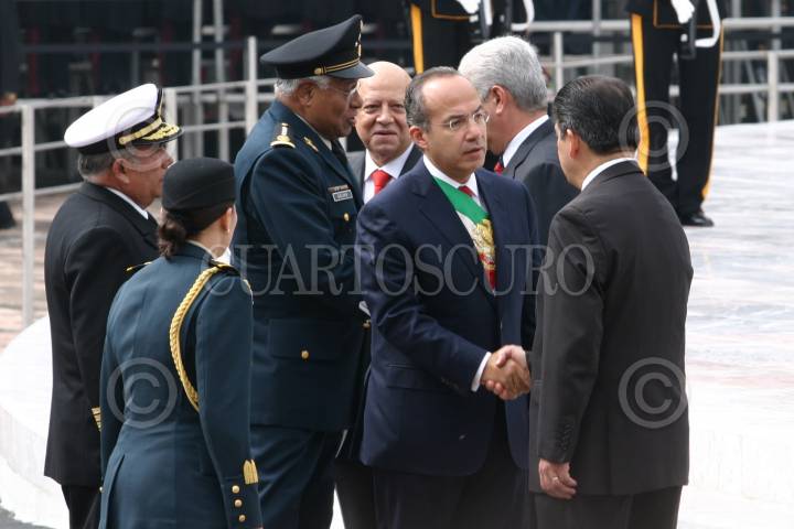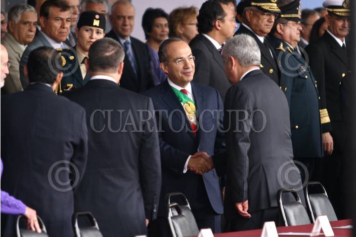 MÉXICO, D.F. 13SEPTIEMBRE2009.- El presidente Felipe Calderón saluda a Francisco Ramírez Acuña, presidente de la mesa directiva de la Cámara de Diputados a su llegada a la ceremonia conmemorativa al CLXII aniversario de la gesta heroica de los Niños Héroes que se realizo en el al Altar a la Patria del Bosque de Chapultepec. FOTO: RODOLFO ANGULO/CUARTOSCURO.COM