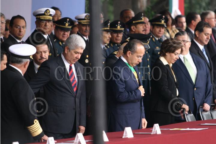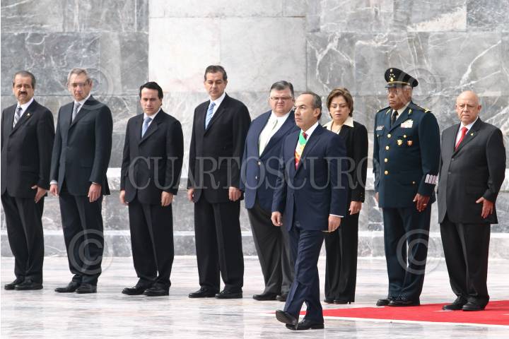 MÉXICO, D.F. 13SEPTIEMBRE2009.- Genaro Garcia Luna, titular de la Secretaria de Seguridad pública Federal; Francisco Saynez, secretario de Marina; Carlos Navarrete, presidente de la mesa directiva del Senado de la República; Francisco Ramírez Acuña, presidente de la mesa directiva de la Cámara de Diputados; el presidente Felipe Calderón; Guillermo Ortiz Mayagoitia, ministro de la Suprema Corte de Justicia y Guillermo Galván, secretario de Defensa durante la ceremonia conmemorativa al CLXII aniversario de la gesta heroica de los Niños Héroes que se realizo en el al Altar a la Patria del Bosque de Chapultepec. FOTO: RODOLFO ANGULO/CUARTOSCURO.COM
