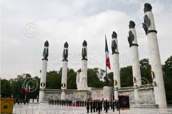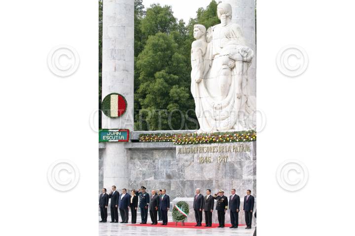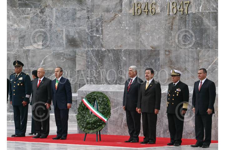 MÉXICO, D.F. 13SEPTIEMBRE2009.- Francisco Saynez, secretario de Marina; Carlos Navarrete, presidente de la mesa directiva del Senado de la República; Francisco Ramírez Acuña, presidente de la mesa directiva de la Cámara de Diputados; el presidente Felipe Calderón; Guillermo Ortiz Mayagoitia, ministro de la Suprema Corte de Justicia y Guillermo Galván, secretario de Defensa durante la ceremonia conmemorativa al CLXII aniversario de la gesta heroica de los Niños Héroes que se realizo en el al Altar a la Patria del Bosque de Chapultepec. FOTO: RODOLFO ANGULO/CUARTOSCURO.COM