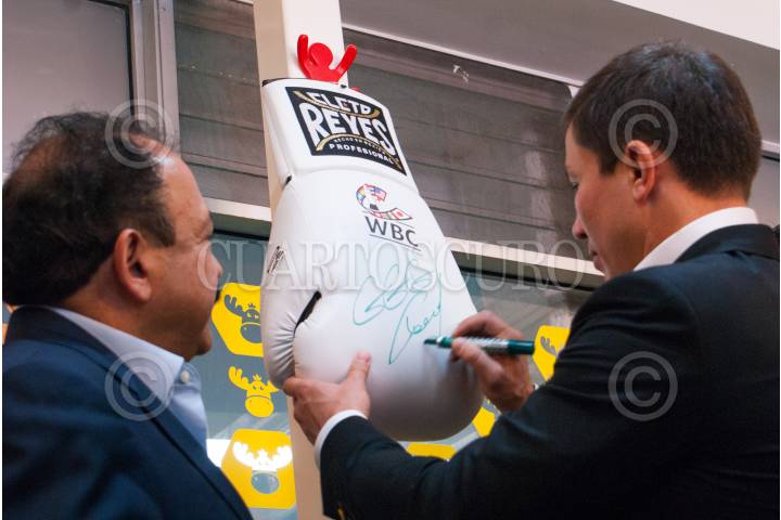 CIUDAD DE MÉXICO, 20NOVIEMBRE2017.- Armando Ahued Ortega, Secretario de Salud de la Ciudad de México, realizó un recorrido por el Hospital Pediátrico Moctezuma, en compañía del Boxeador Kazajo, Gennady Golovkin. Tuvieron una pequeña convivencia con los niños del área de urgencias. Un guante de la marca Cleto Reyes con la firma de Golovkin, fue colgado en el salón de juegos de dicha área. FOTO: JESÚS VERDUGO/ CUARTOSCURO.COM