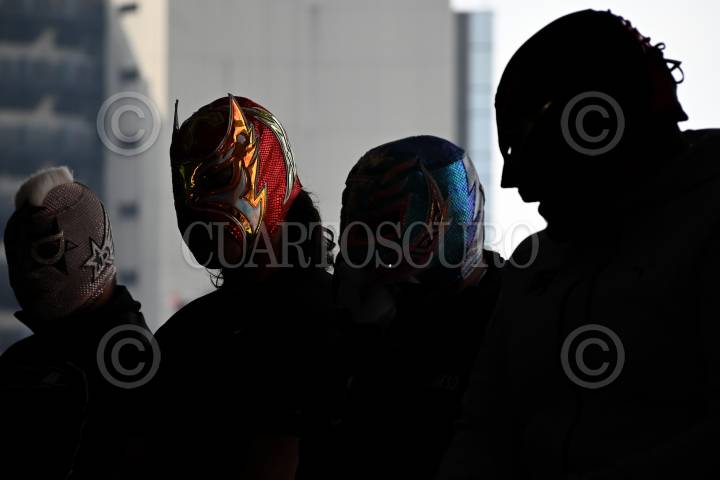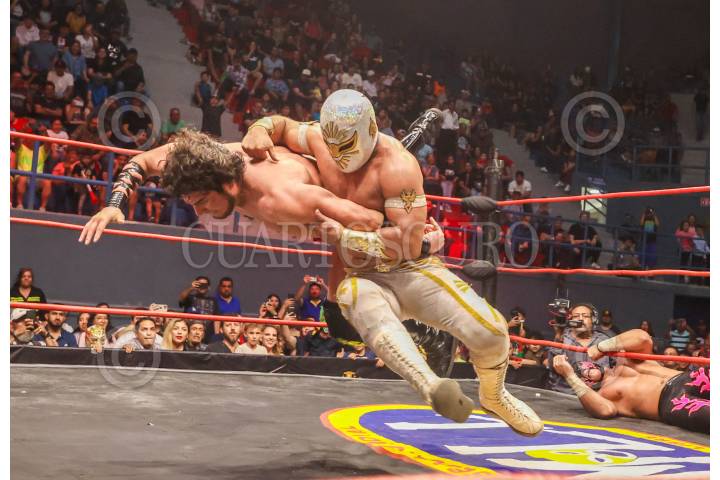 CIUDAD DE MÉXICO, 18AGOSTO2024. - El luchador Euforia le quita la máscara a El Valiente, lo que provocó su descalificación del encuentro. FOTO: DANIEL AUGUSTO /CUARTOSCURO.COM