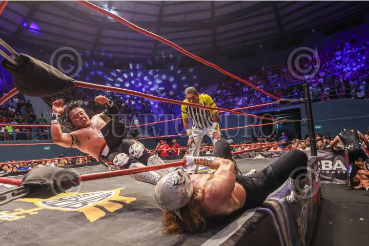 CIUDAD DE MÉXICO, 18AGOSTO2024. - Mephisto y Magnus someten al Último Guerrero durante su encuentro de esta noche. FOTO : DANIEL AUGUSTO /CUARTOSCURO.COM