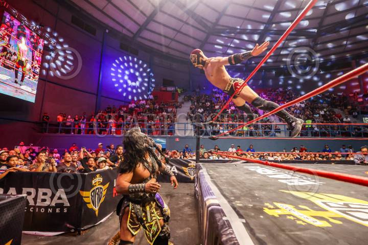CIUDAD DE MÉXICO, 18AGOSTO2024. - Kemalito salta sobre el luchador inglés, Flip Gordon, durante la lucha estelar México Vs Resto del Mundo. FOTO: DANIEL AUGUSTO /CUARTOSCURO.COM