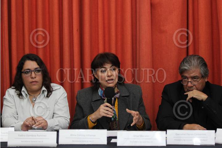 CIUDAD DE MÉXICO, 04OCTUBRE2017.- Alma Corona Villamar, secretaria general de la Sección 3 del sindicato de cultura; Elisa Morales, secretaria general de la sección 11, y Gamaliel Flores Cervantes, presidente del Consejo Ejecutivo Nacional, durante la conferencia de prensa en el Centro Nacional de Comunicación Social (CENCOS) para anunciar los peligros y daños que pueden sufrir trabajadores en museos y zonas arqueológicas ante siniestros. Esto con motivo del pasado sismo de 7.1 grados que dejó serios daños en diversos edificios de la capital. FOTO: GALO CAÑAS /CUARTOSCURO.COM