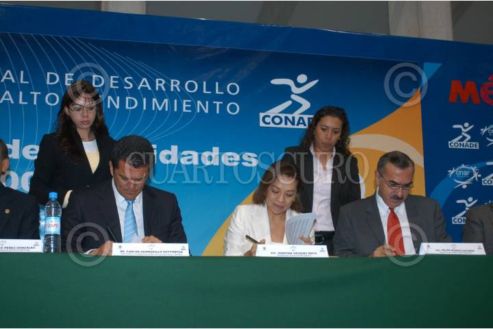 MÉXICO, D.F., 08ENERO2007.- Carlos Hermosillo, titular de Conade, Josefina Vázquez Mora, secretaria de Educación Pública, y Felipe Muñoz, presidente del COM, durante la inauguración del ciclo escolar en el Centro Nacional de Desarrollo de Talentos y Alto Rendimiento. FOTO: FERNANDO GARCÍA/CUARTOSCURO.COM