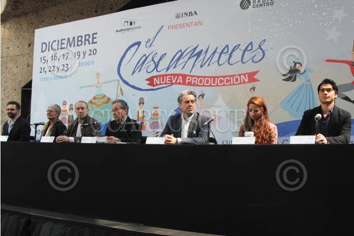 CIUDAD DE MÉXICO, 30OCTUBRE2017.- Sergio Villegas, director de escenografía; Laura Rodé, encargada de diseño de iluminación; Mario Galizzi, director de la Compañía Nacional de Danza (CND); Roberto Vázquez, subdirector general del Instituto Nacional de las Bellas Artes (INBA), Srba Dinic, director de Orquesta; Ana Elisa Mena, primer bailarina de la CND, y Argenis Montalvo, primer bailarín de la CND, durante la conferencia de prensa para anunciar el nuevo montaje que tendrá “El Cascanueces”, en el Auditorio Nacional. FOTO: GALO CAÑAS /CUARTOSCURO.COM