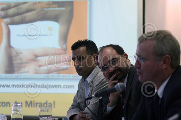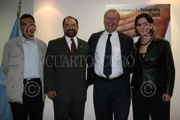 MÉXICO, D.F., 20AGOSTO2009.- Daniel Aguilar, fotografo mexicano, Emilio Álvarez Icaza, presidente de la Comisión de Derechos Humanos del Distrito Federal, junto con Arie Hoekman, representante en México de la Organización de las Naciones Unidas, durante la presentación del "3er Concurso de Fotografía, Mirada Joven 2009". FOTO: IVAN MENDEZ/CUARTOSCURO.COM