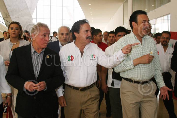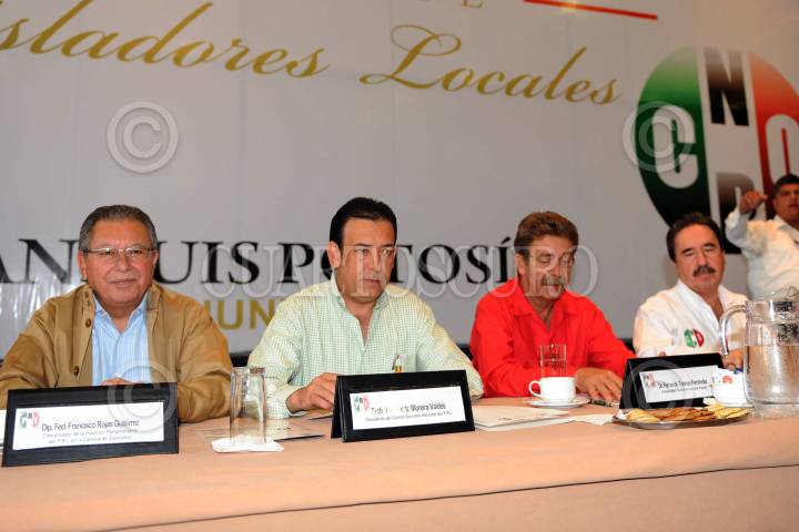 SAN LUIS POTOSI, SAN LUIS POTOSI, 04JUNIO2011.- Francisco Rojas, coordinador del PRI en la Cámara de Diputados; el presidente del CEN del PRI, Humberto Moreira; Fernando Toranzo, gobernador del estado y Emilio Gamboa, dirigente de la CNOP durante la inauguración de la convención nacional de diputados locales de la CNOP. FOTO: CUARTOSCURO.COM