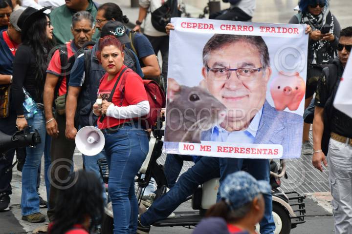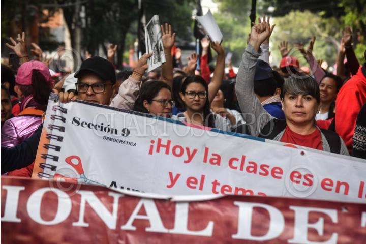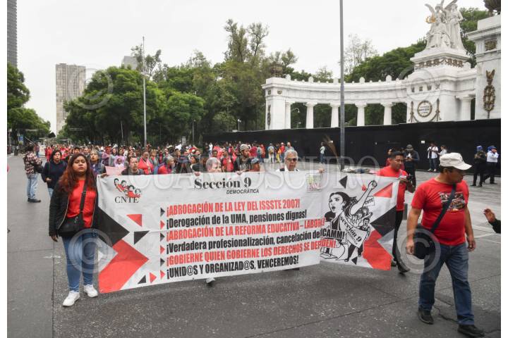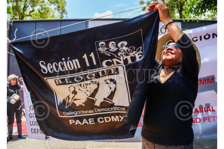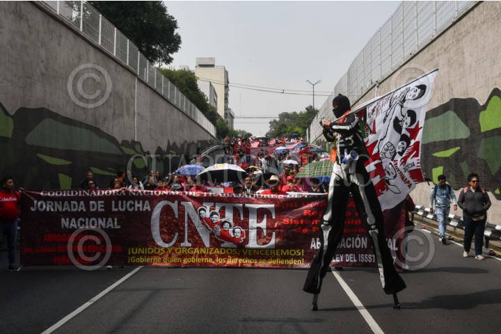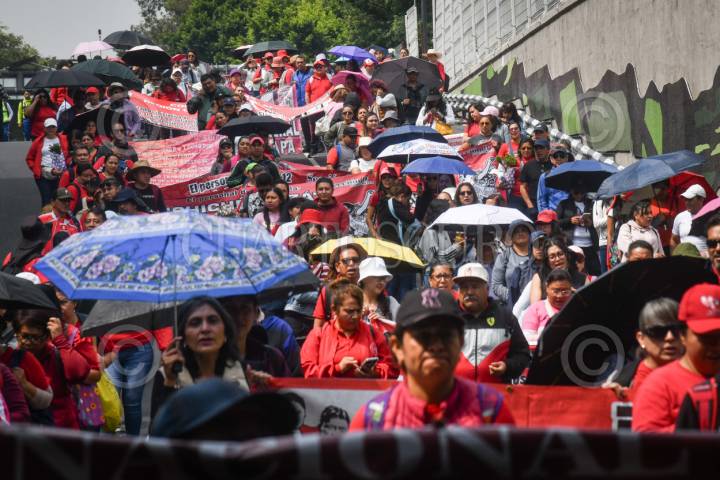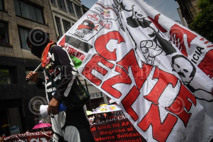 CIUDAD DE MÉXICO, 17JULIO2025.- Maestros de la Coordinadora Nacional de Trabajadores de la Educación (CNTE) realizaron una marcha que partió de la Unidad de Administración y Finanzas de la Autoridad Educativa Federal de la Ciudad de México (AEFCM) rumbo al zócalo capitalino para exigir al gobierno federal la devolución de los días de salario que les descontaron por haber participado en el paro laboral de hace un mes. FOTO: MARIO JASSO/CUARTOSCURO.COM