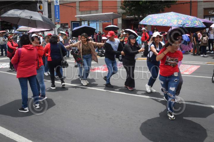CIUDAD DE MÉXICO, 10JULIO2025.- Maestros de la Coordinadora Nacional de Trabajadores de la Educación (CNTE) de la sección 9 realizaron una marcha que partió del Hemiciclo a Juárez rumbo a un bloqueo sobre Eje Central en donde exigen la gobierno federal se cumplan sus demandas. En la imagen, maestras realizan un baile tradicional con la música que se encontra sonando alrededor. FOTO: MARIO JASSO/CUARTOSCURO.COM