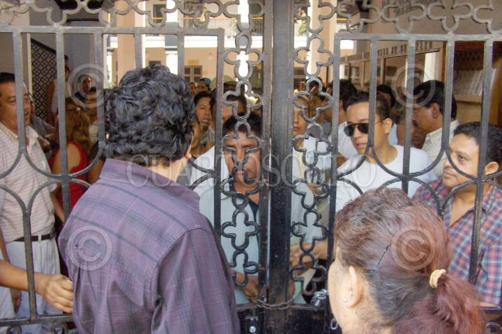 CHILPANCINGO, GUERRERO 14DICIEMBRE2005.- Maestros que laboran en los colegios de bachilleres por cooperacion, tomaron las instalaciones de las oficinas generales, impidiendo el paso de maestros y personal del gobierno del estado que se dirigia a cobrar su salario al interior de dicho inmueble, esto para exgir al director general de los COBACH Carlos Payan, el pago de su salario, recategorizaciones, un alto a las represiones que han sufrido, entre otras demandas. FOTO: Oscar Alvarado/CUARTOSCURO.COM